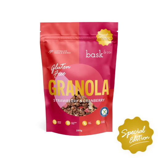 Bask & CoThis Strawberry & Cranberry 'Special Edition' Gluten Free Granola is going to become your new breakfast favourite. It is the perfect blend of t...